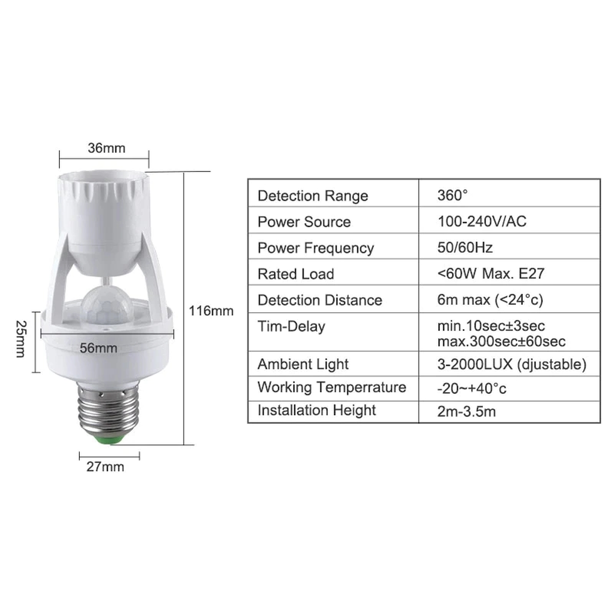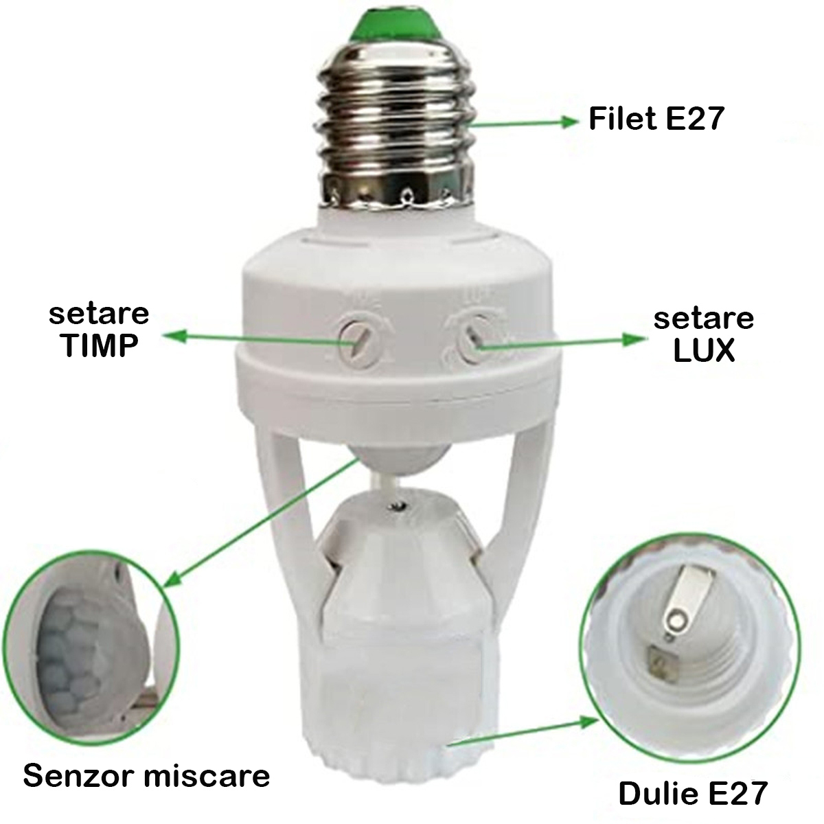3. Adaptor pentru soclu de bec reglabil – Dispozitivul de cronometrare poate seta timpul (10 secunde-5 minute) si iluminarea reglabila LUX (3-2000lux), puteti seta starea si modul de lucru in functie de nevoile dvs.