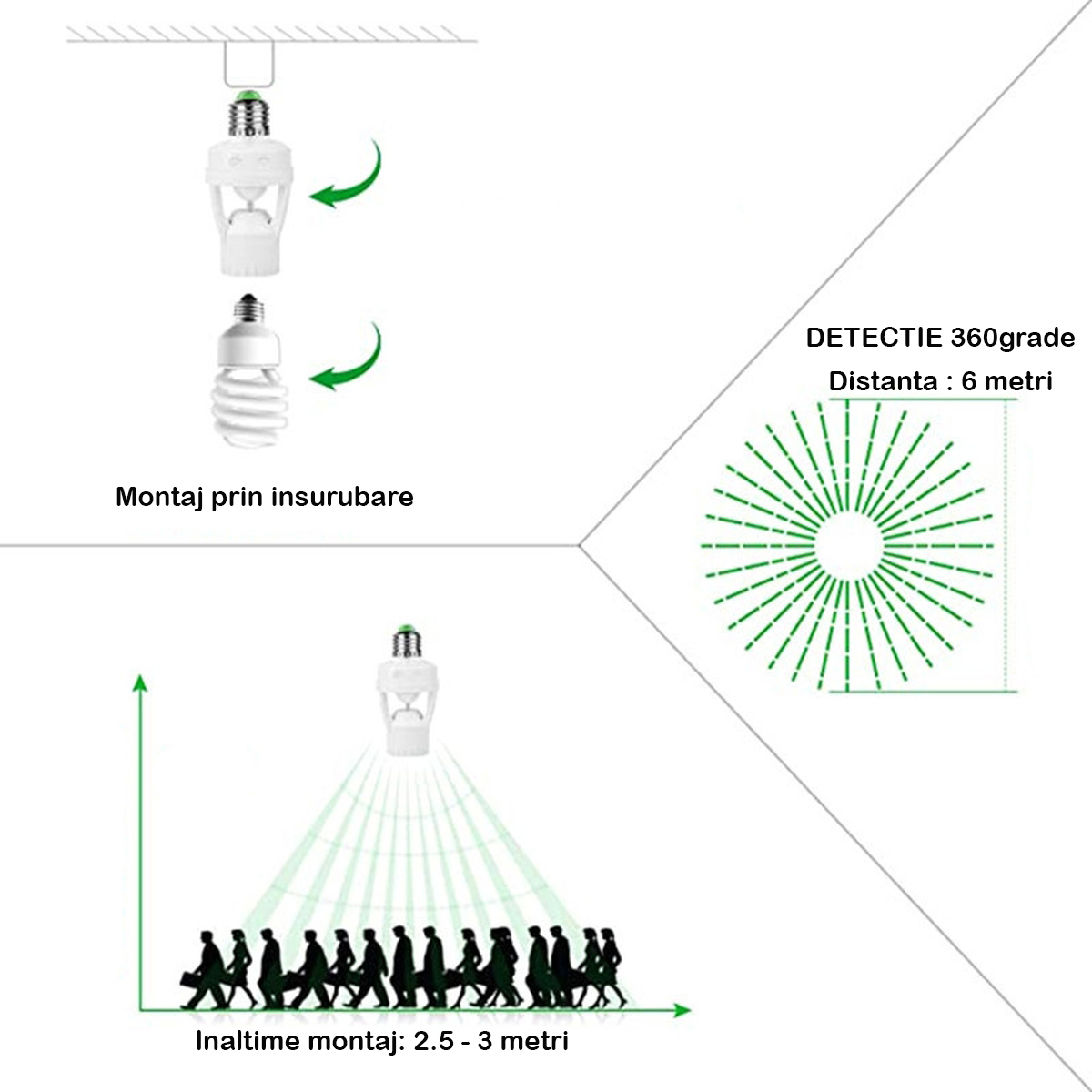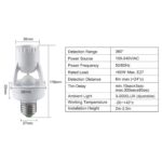 2. Ilumineaza imediat ce usa se deschide – Cand soclul de lumina cu senzor de miscare este montat la 2-3,5 m deasupra podelei si conectat la orice bec E27 (<60W) in jos, soclul detecteaza miscarea pana la 6 m distanta in orice directie. Se opreste automat dupa timpul de setare daca nu este detectata nicio miscare IR, pentru a va ajuta sa economisiti costurile de energie.